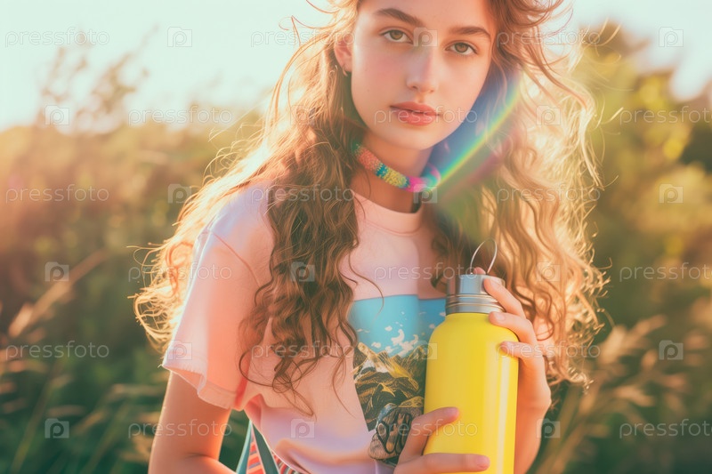 Портрет девочки-подростка, держащей бутылку с водой на улице при закате