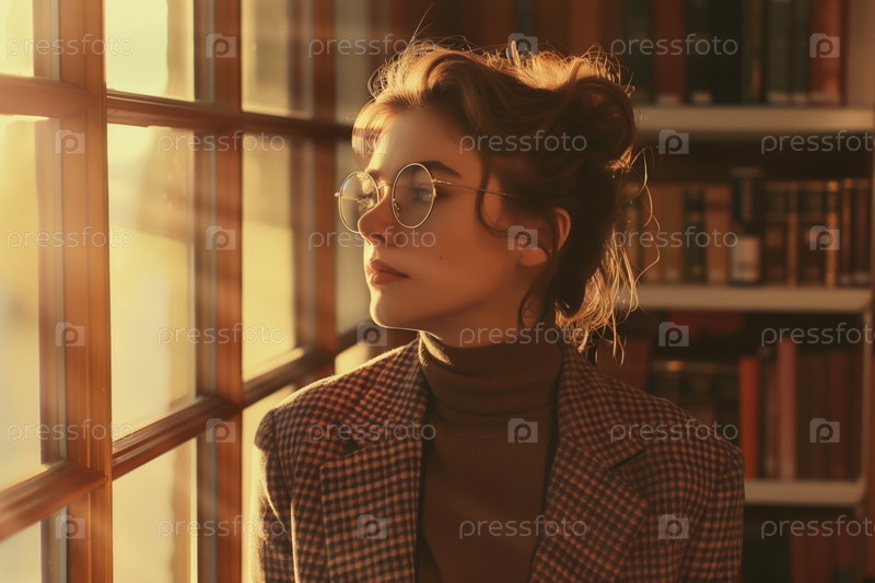 Молодая взрослая женщина с очками смотрит в окно библиотеки