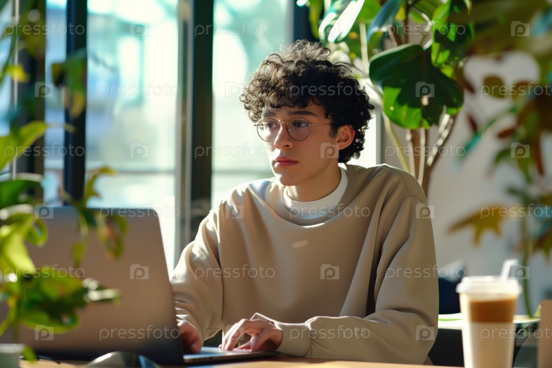 Портрет мальчика-подростка, использующего ноутбук для учебы в современном рабочем пространстве