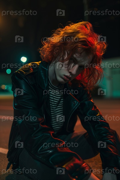 Портрет мальчика-подростка, сидящего на улице и размышляющего ночью