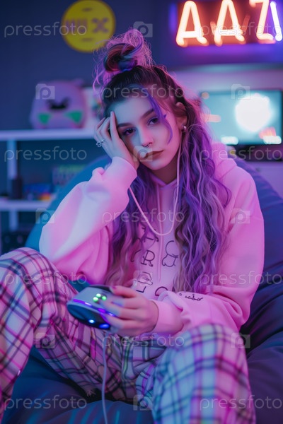 Портрет девочки-подростка, расслабляющейся и играющей с помощью контроллера