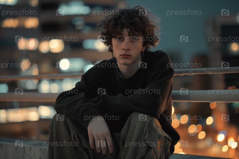 Портрет мальчика-подростка, сидящего на улице и отражающего городскую культуру