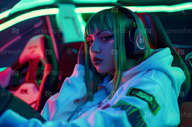 Портрет девочки-подростка, слушающей музыку в футуристической автомобильной обстановке