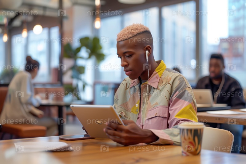 Черный подросток использует цифровой планшет, слушая музыку в современном кафе