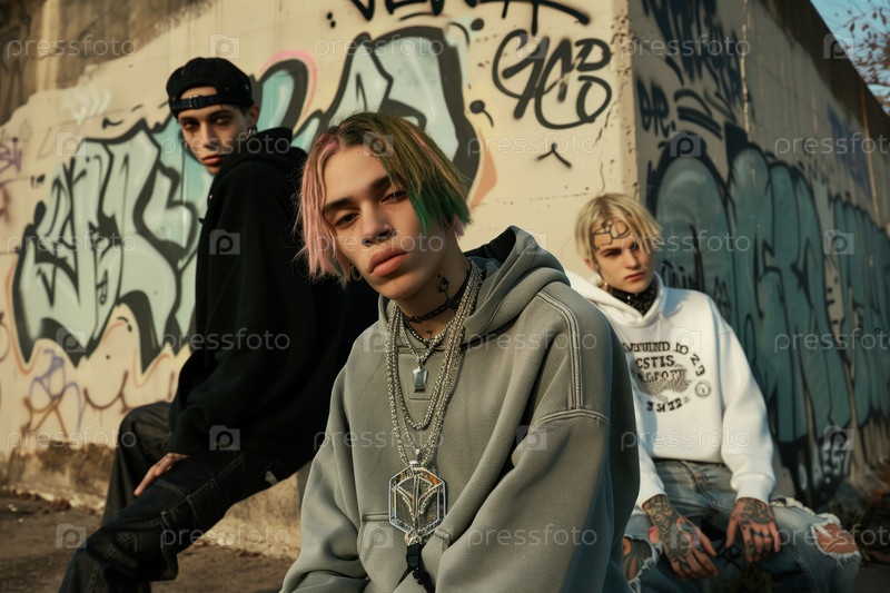 Многонациональные подростки, выражающие культуру поколения Z, позируют возле стены граффити