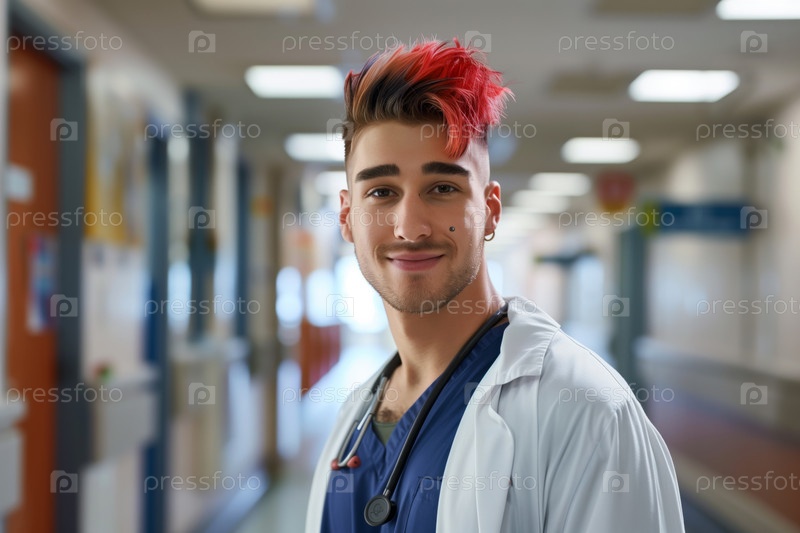Портрет молодого человека, уверенно улыбающегося в коридоре больницы