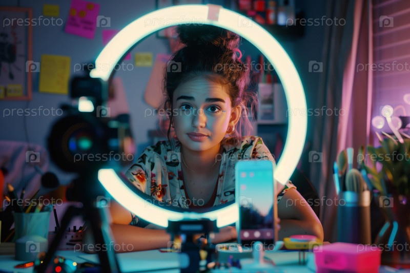 Портрет девочки-подростка, создающей контент для социальных сетей на домашнем рабочем столе