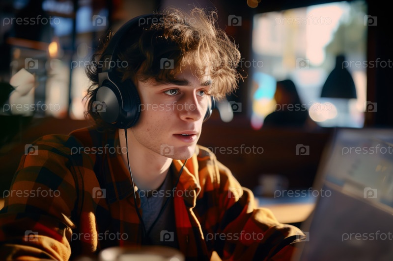 Мальчик-подросток носит наушники с помощью ноутбука в современном кафе