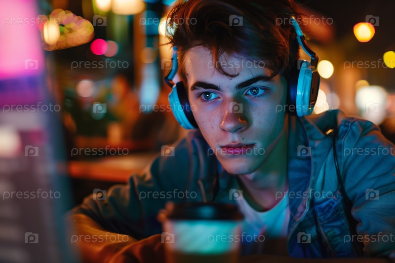 Портрет мальчика-подростка, носящего наушники и использующего ноутбук ночью