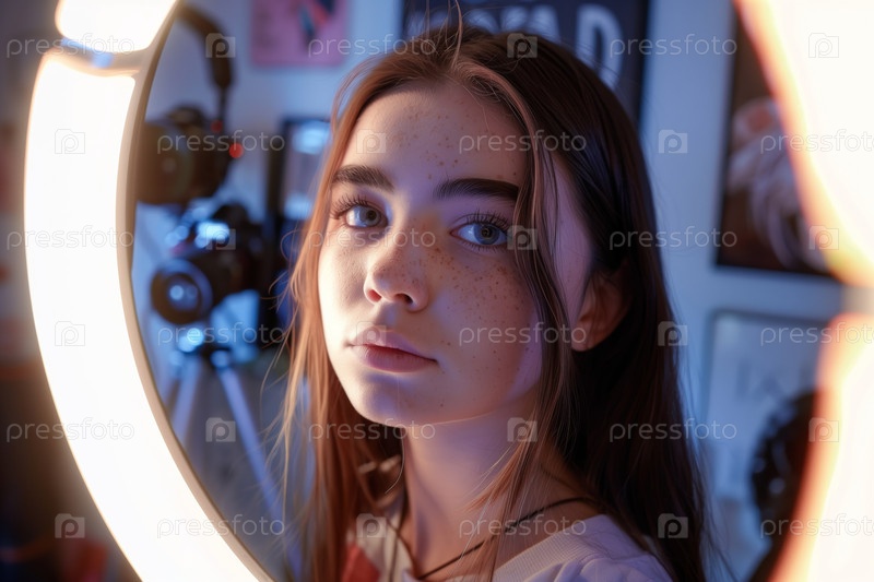 Портрет девочки-подростка, смотрящей на камеру в окружении кольцевого света