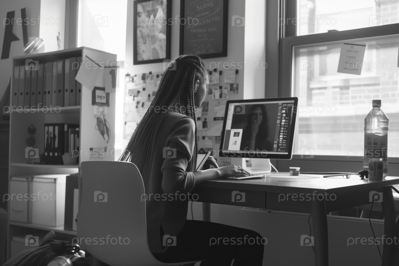 Молодая чернокожая женщина редактирует фотографии на компьютере в современном творческом рабочем пространстве