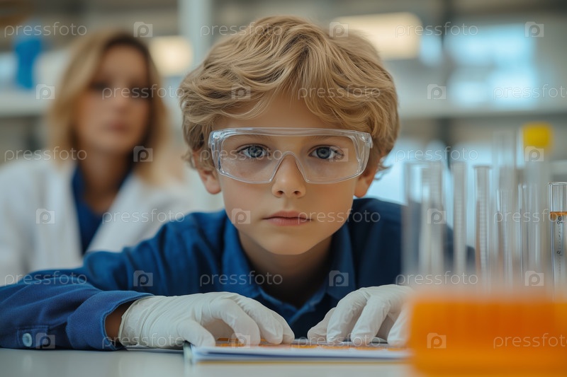 Портрет мальчика, носящего очки безопасности и проводящего научный эксперимент