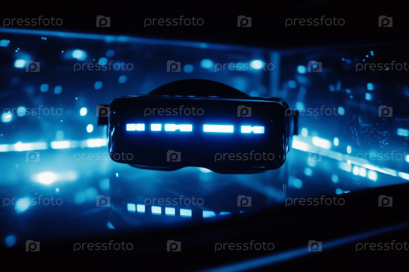 Гарнитура виртуальной реальности, освещающая лабораторную среду с синим светом