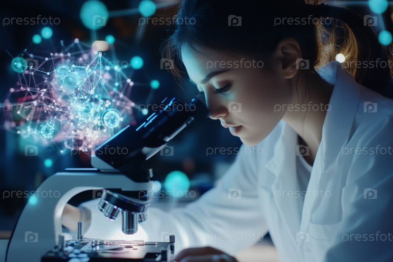Молодая взрослая женщина изучает образец под микроскопом в лаборатории