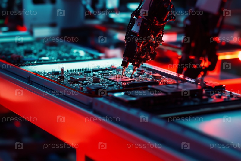 Роботизированные руки собирают электронные платы в лаборатории современной науки