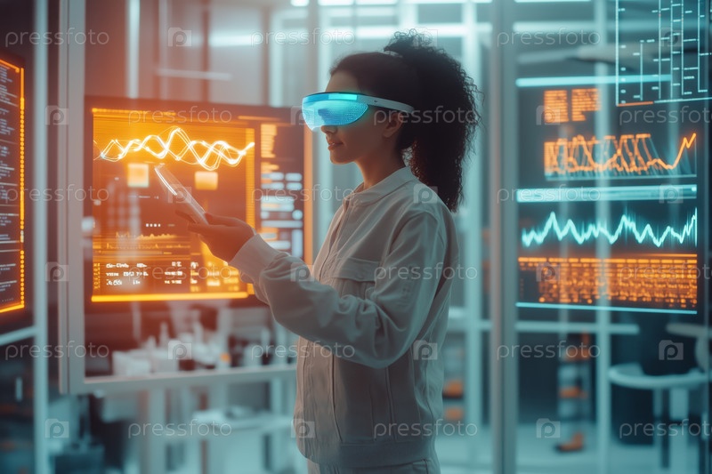 Молодая взрослая чернокожая женщина использует очки дополненной реальности в современной лаборатории