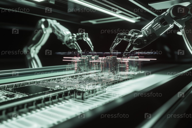 Роботизированные руки собирают электронные платы в футуристической научной лаборатории