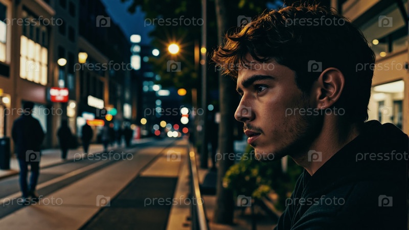 Молодой человек созерцает, сидя один на городской улице ночью