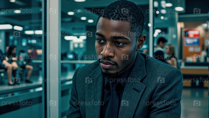 Молодой взрослый чернокожий мужчина сидит один в офисе, выглядя задумчивым и озабоченным