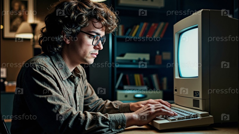 Молодой взрослый мужчина работает на старинном компьютере в домашней офисной обстановке