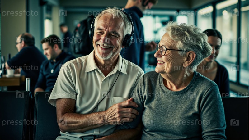 Старший мужчина слушает музыку со старшей женщиной, улыбающейся