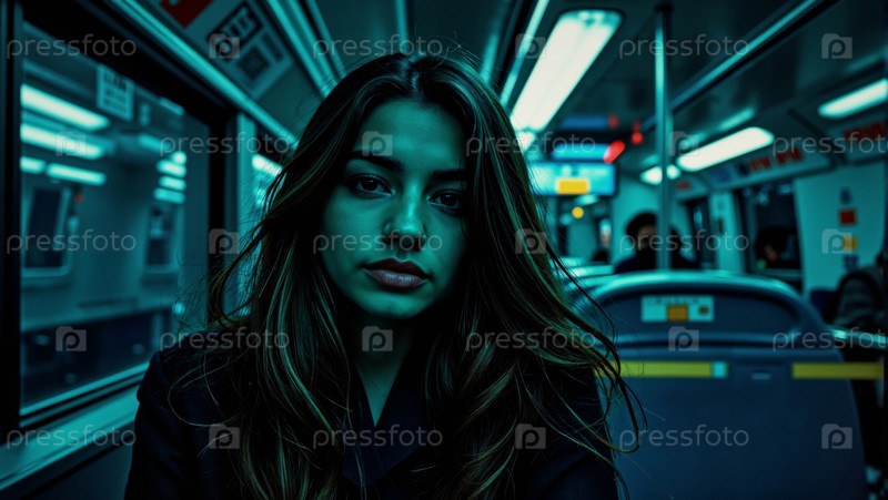 Портрет молодой взрослой женщины, сидящей одной внутри поезда метро