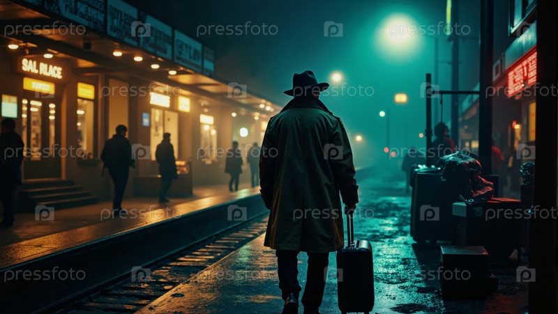 Мужчина среднего возраста ходит один с чемоданом на городской улице ночью