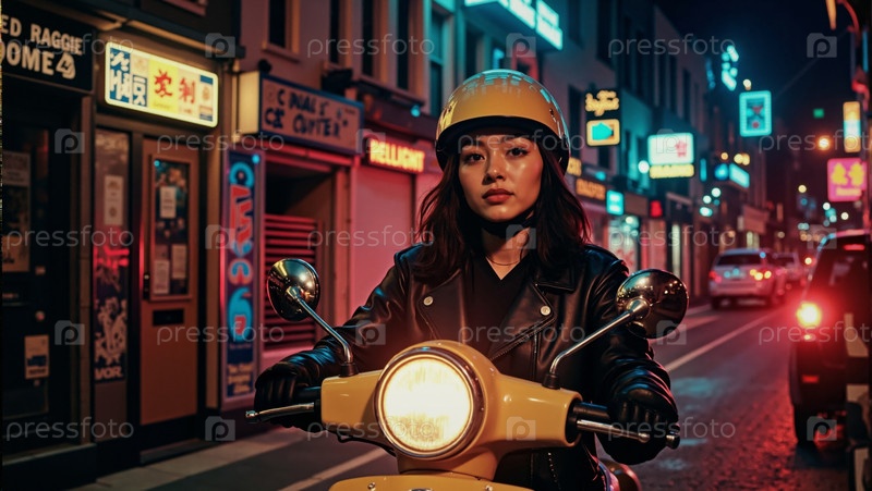 Портрет молодой взрослой азиатской женщины, едущей на скутере по городской улице ночью