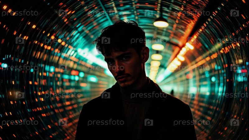 Портрет молодого взрослого мужчины, стоящего в освещенном туннеле