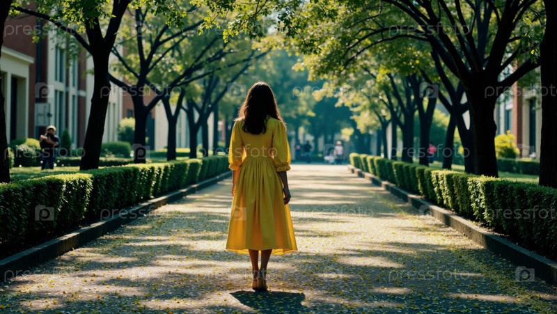 Молодая взрослая женщина ходит одна вдоль дорожки с деревьями на открытом воздухе