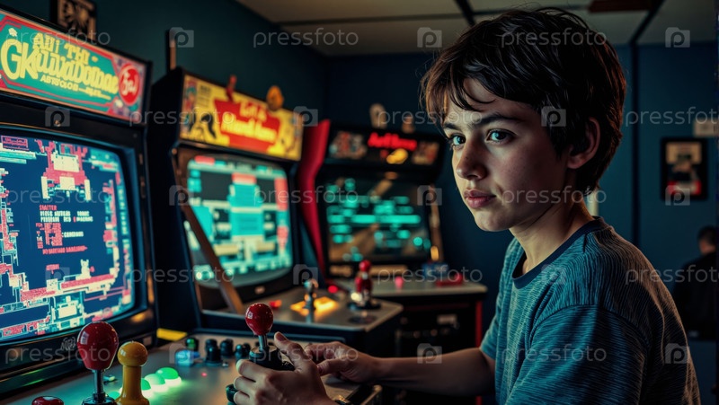 Портрет мальчика-подростка, играющего в аркадную игру в ретро игровом центре