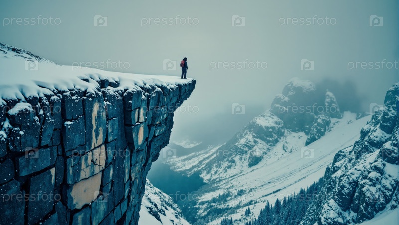 Молодой взрослый мужчина стоит на краю снежной скалы с видом на горную долину