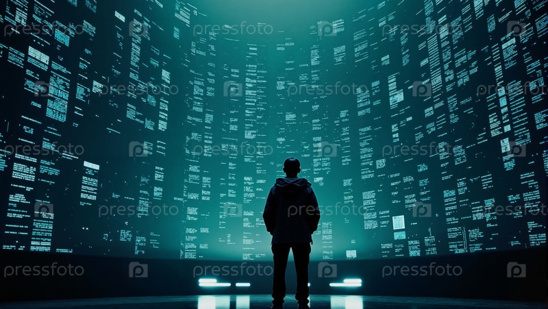 Молодой взрослый мужчина стоит в футуристической комнате, окруженной цифровыми экранами данных