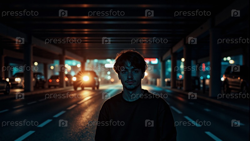 Портрет молодого человека, стоящего в одиночестве под мостом ночью