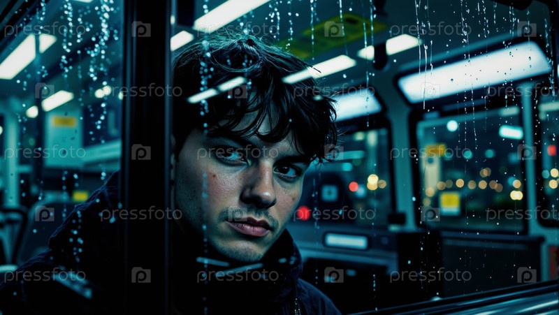 Портрет молодого человека, сидящего в одиночестве в автобусе и смотрящего из окна