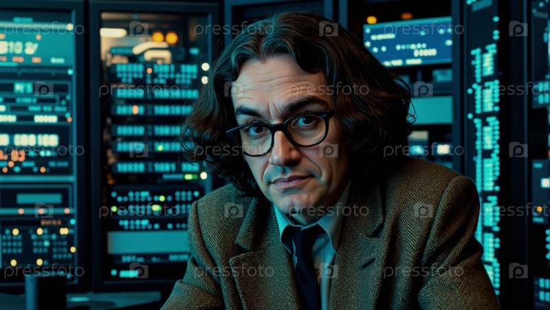 Портрет мужчины среднего возраста с очками, работающего в серверной комнате