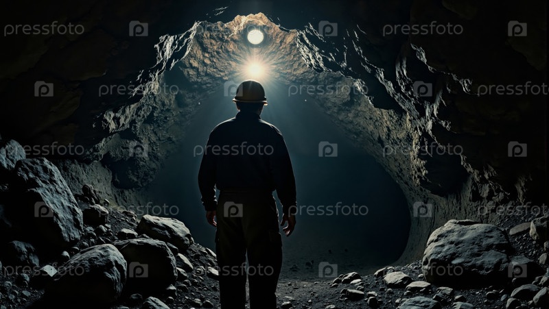 Человек средних лет исследует подземную пещеру, освещенную солнечным светом