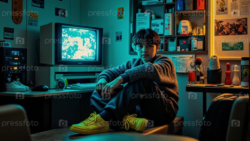 Портрет подросткового азиатского мальчика, сидящего в ретро-комнате и смотрящего компьютерный экран