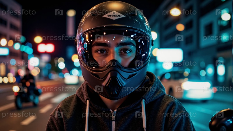 Портрет молодого взрослого испаноязычного мужчины, носящего мотоциклетный шлем ночью