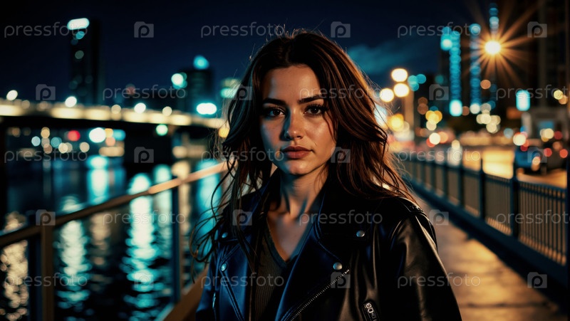 Портрет молодой взрослой женщины, стоящей на городском мосту ночью