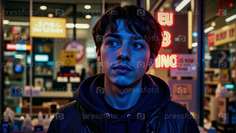 Портрет молодого человека, стоящего на витрине магазина ночью