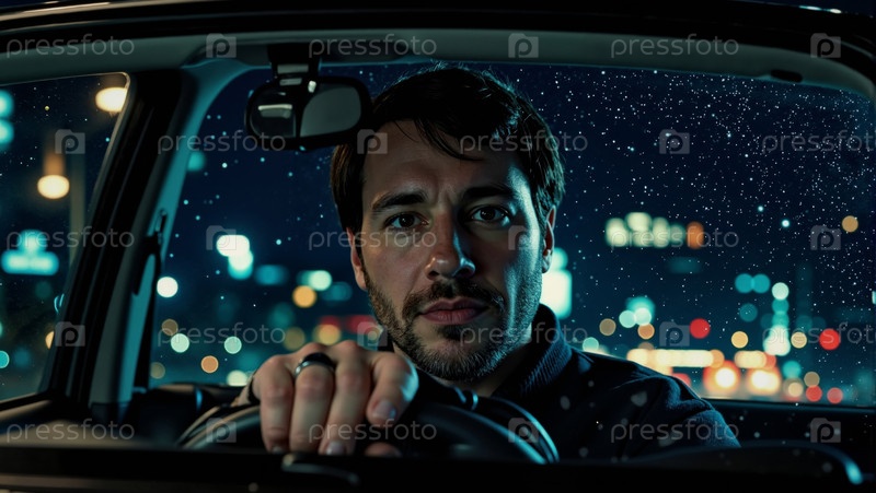 Портрет молодого взрослого мужчины, управляющего автомобилем ночью в городской обстановке
