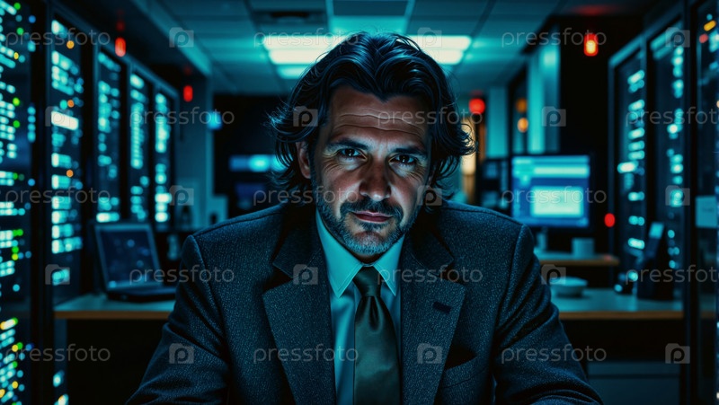 Портрет мужчины средних лет, работающего в центре обработки данных, окруженного серверами