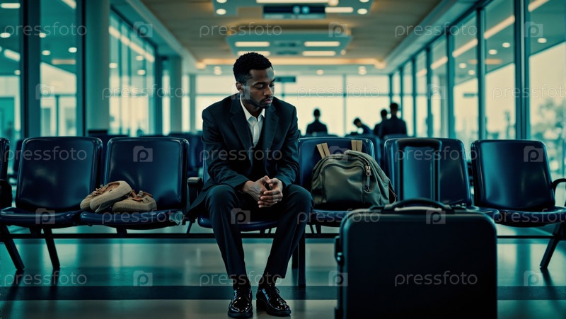Молодой взрослый чернокожий мужчина ждет в терминале аэропорта с багажом и деловым нарядом