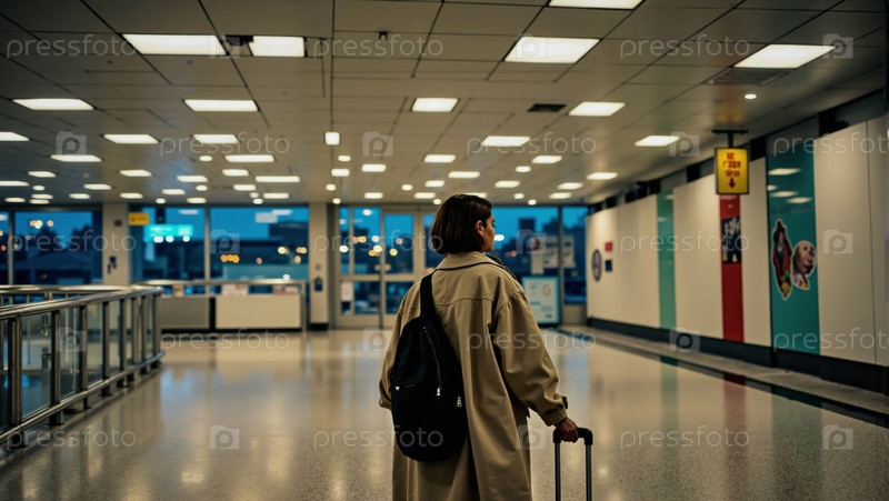 Молодая взрослая женщина проходит через терминал аэропорта с чемоданом