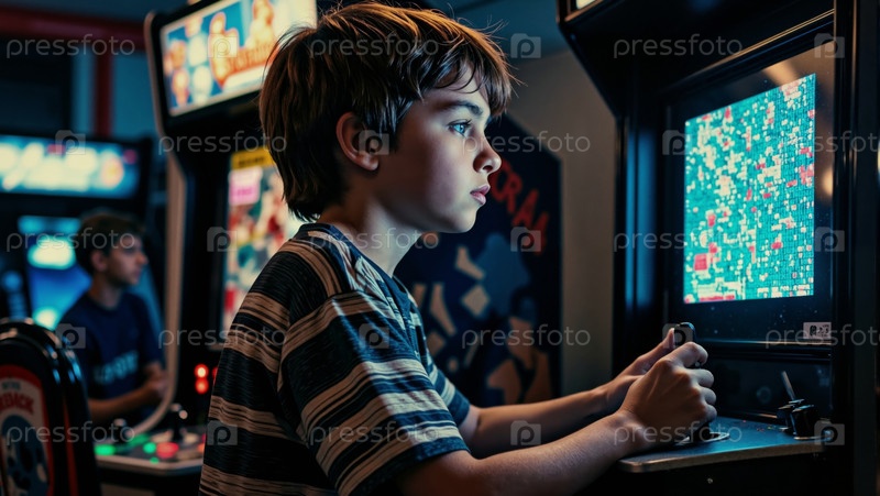 Играя в аркадные игры, сосредоточившись на ретро-игровом центре Boy