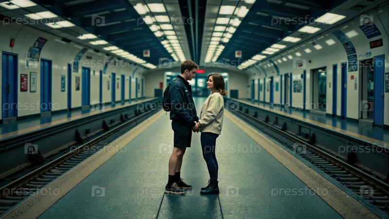 Молодой мужчина и молодая азиатская женщина держатся за руки на станции метро