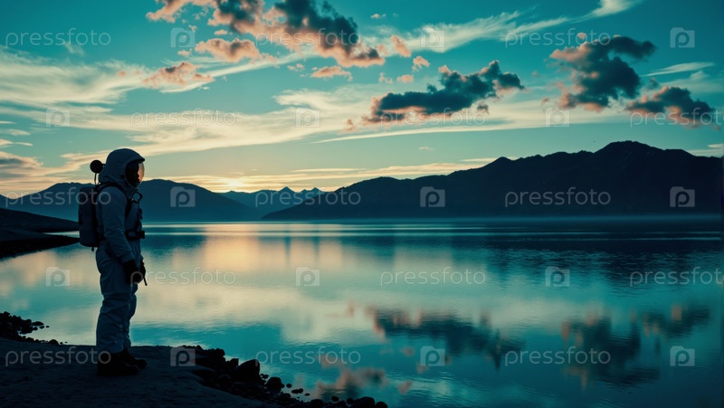 Молодой взрослый мужчина в космическом костюме стоит у горного озера на закате