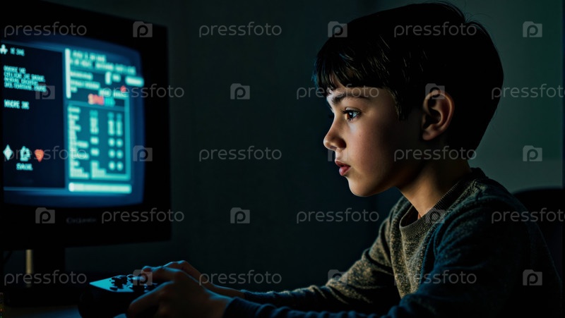 Играя в видеоигры на консоли в темной комнате Concentrating Boy