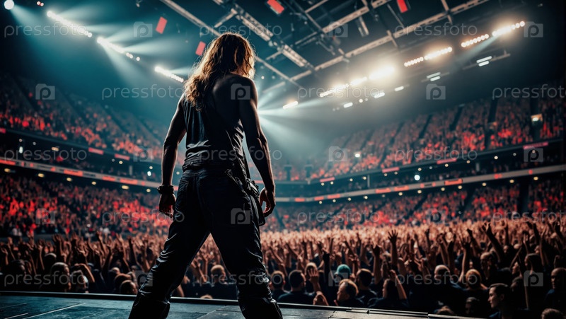 Молодой взрослый мужчина, выступающий на сцене перед большой концертной аудиторией